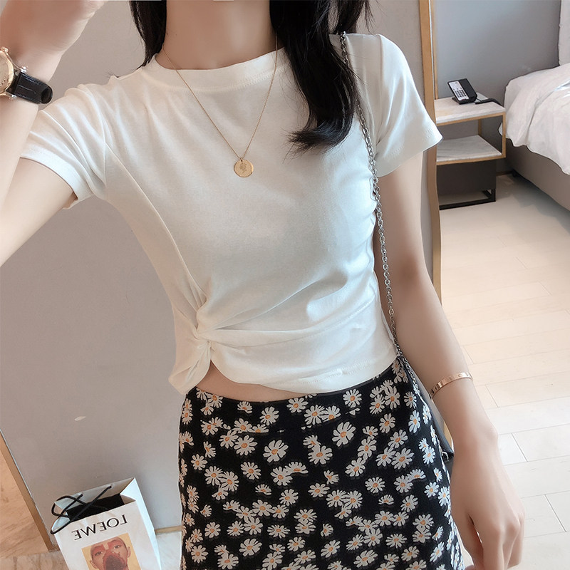 短款上衣女设计感小众2021夏ins新款露脐修身圆领褶皱短袖T恤女潮热门设计联盟服务商